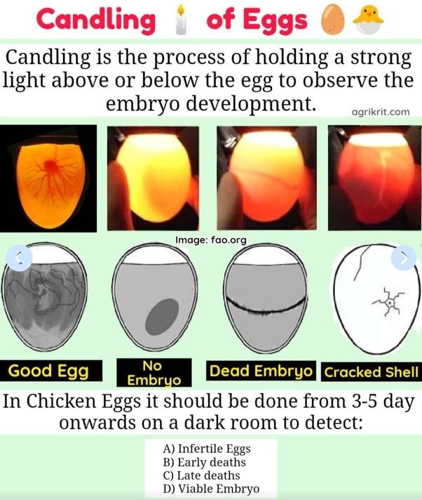 Au jour 10, bougiez (mirer) les œufs pour vous assurer qu’ils se développent.  Retirez tous les œufs clairs ou les œufs embryonnaires morts, car ils peuvent exploser s’ils sont laissés à l’intérieur de l’incubateur tour au court des 21 jours.  Vous recherchez des structures et des mouvements veineux solides.  Ne mirez pas trop longtemps pour éviter le stress de l’embryon.